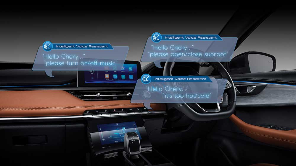 Teknologi sistem cerdas yang dapat berinteraksi dengan Anda dengan melalui perintah suara, untuk mengoperasikan fitur-fitur pada mobil Anda. Dapat diaktifkan dengan mengatakan “Hello Chery” atau dengan cara menekan tombol pada stir kemudi, lalu di ikuti dengan mengatakan perintah untuk fitur di mobil yang ingin diatur oleh Anda.